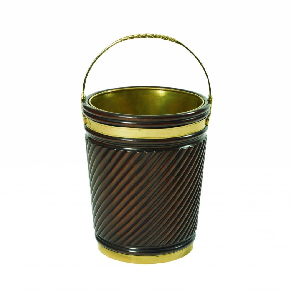 Irish Georgian style brass bound mahogany turf, or peat bucket. The tapered swirling moulded sides have polished brass bands and faceted and twist grip loop handles; the interiors are fitted with brass liners.