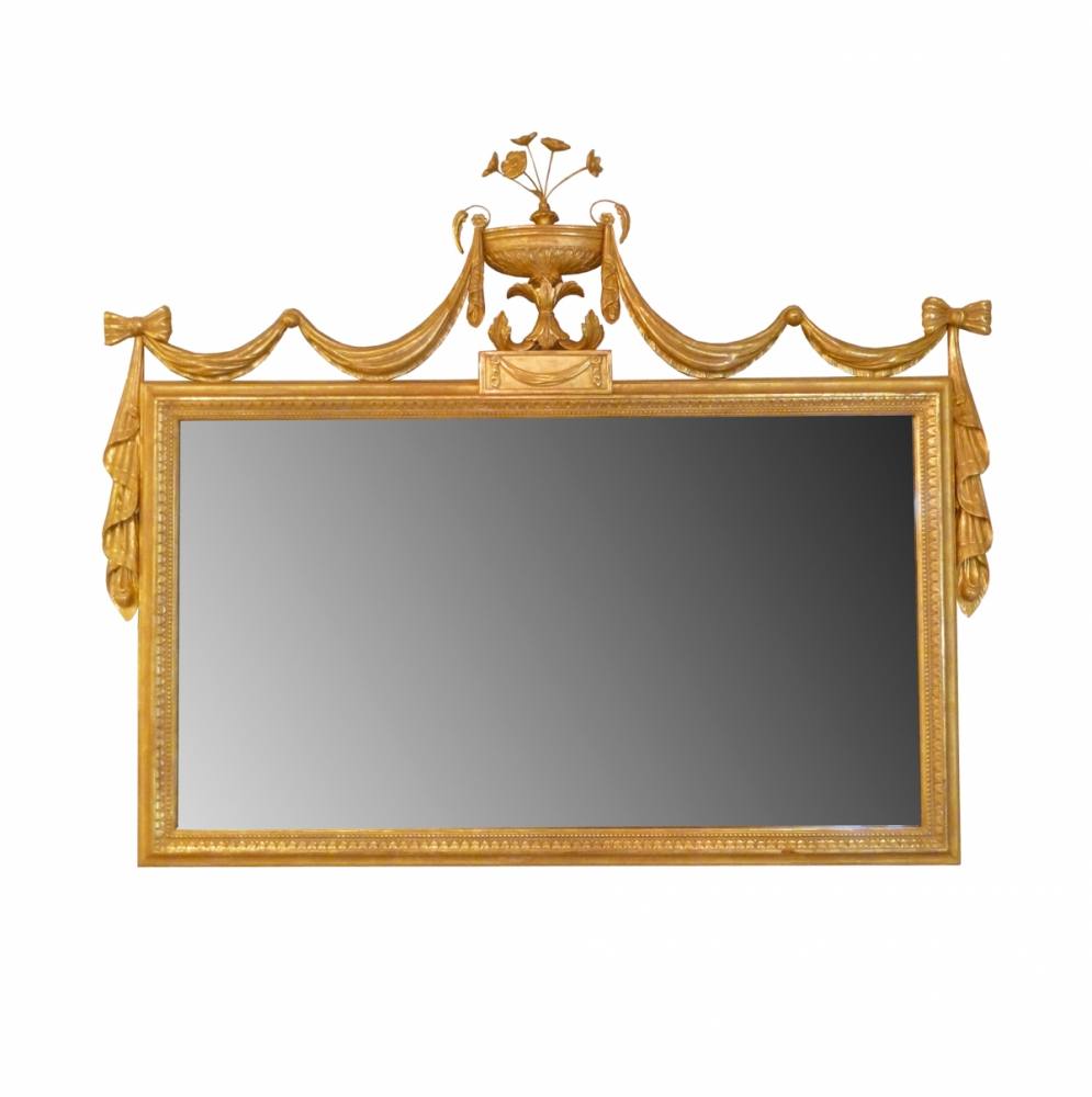 A carved giltwood overmantel mirror with classical urn and drapery decoration in the late 18th Century Hepplewhite manner.