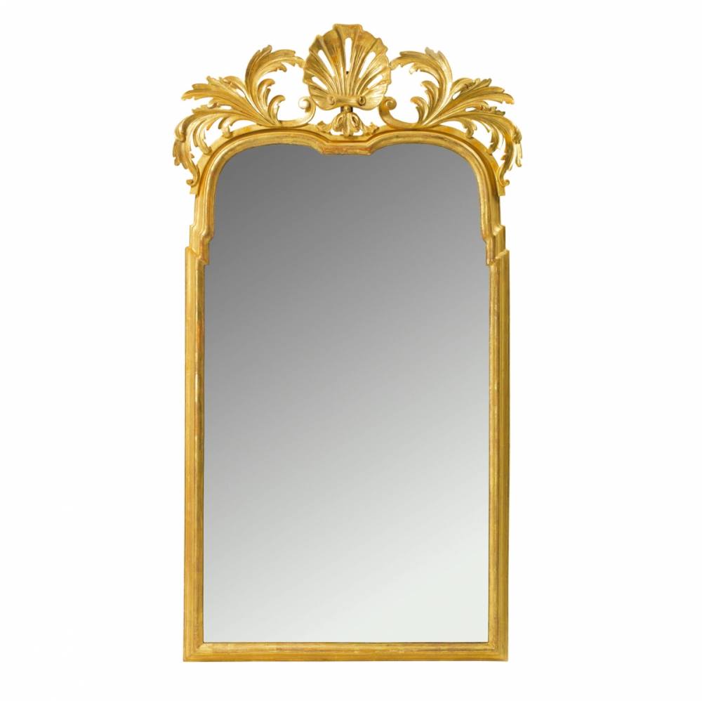 The shaped looking glass in this Queen Anne style mirror has a plain carved giltwood moulded frame. The finely carved cresting of acanthus leaves is centred by a shell, raised on gathered leaves.