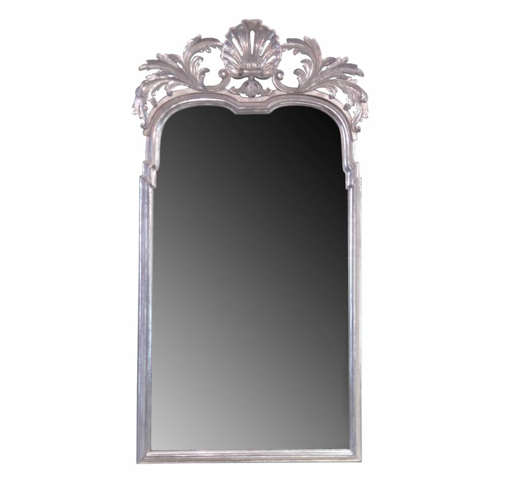 The shaped looking glass in this Queen Anne style mirror has a plain carved giltwood moulded frame. The finely carved cresting of acanthus leaves is centred by a shell, raised on gathered leaves.