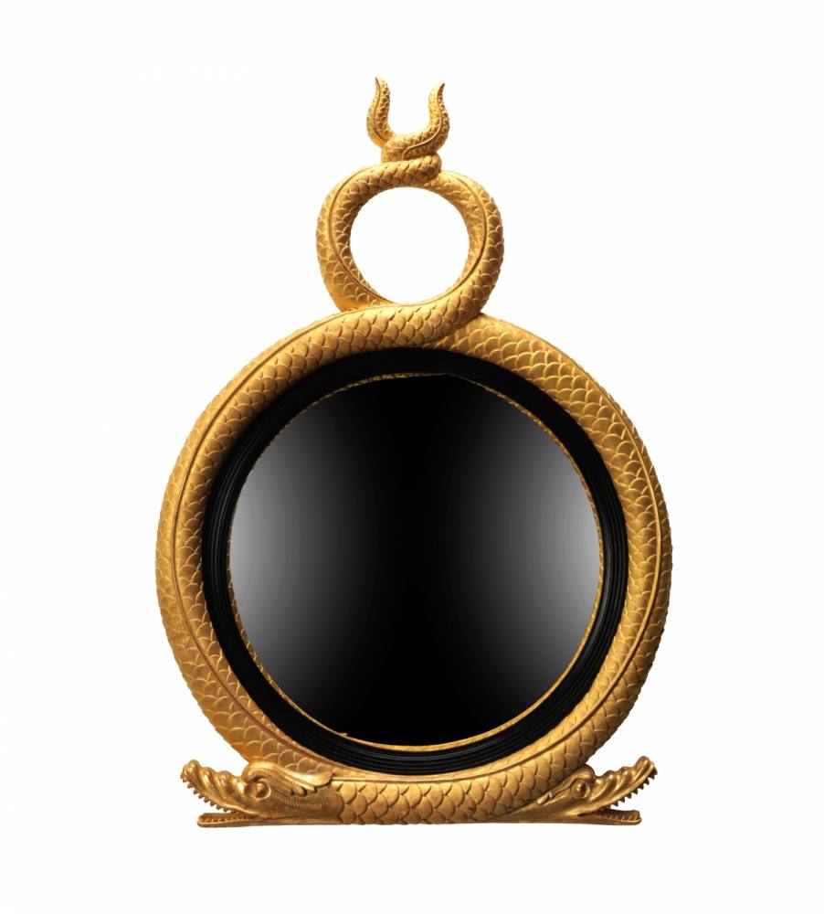 Formed by a pair of serpents entwining their tails, this Regency design combines contrasting high and low lights of gilding.