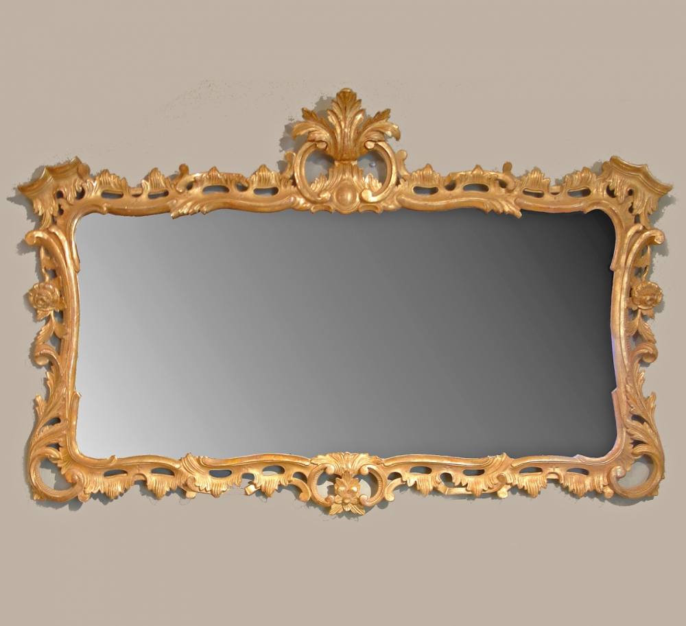 A Chippendale carved giltwood overmantel mirror in the Rococo style, with C-scrolls, acanthus, and leaf spray cresting.