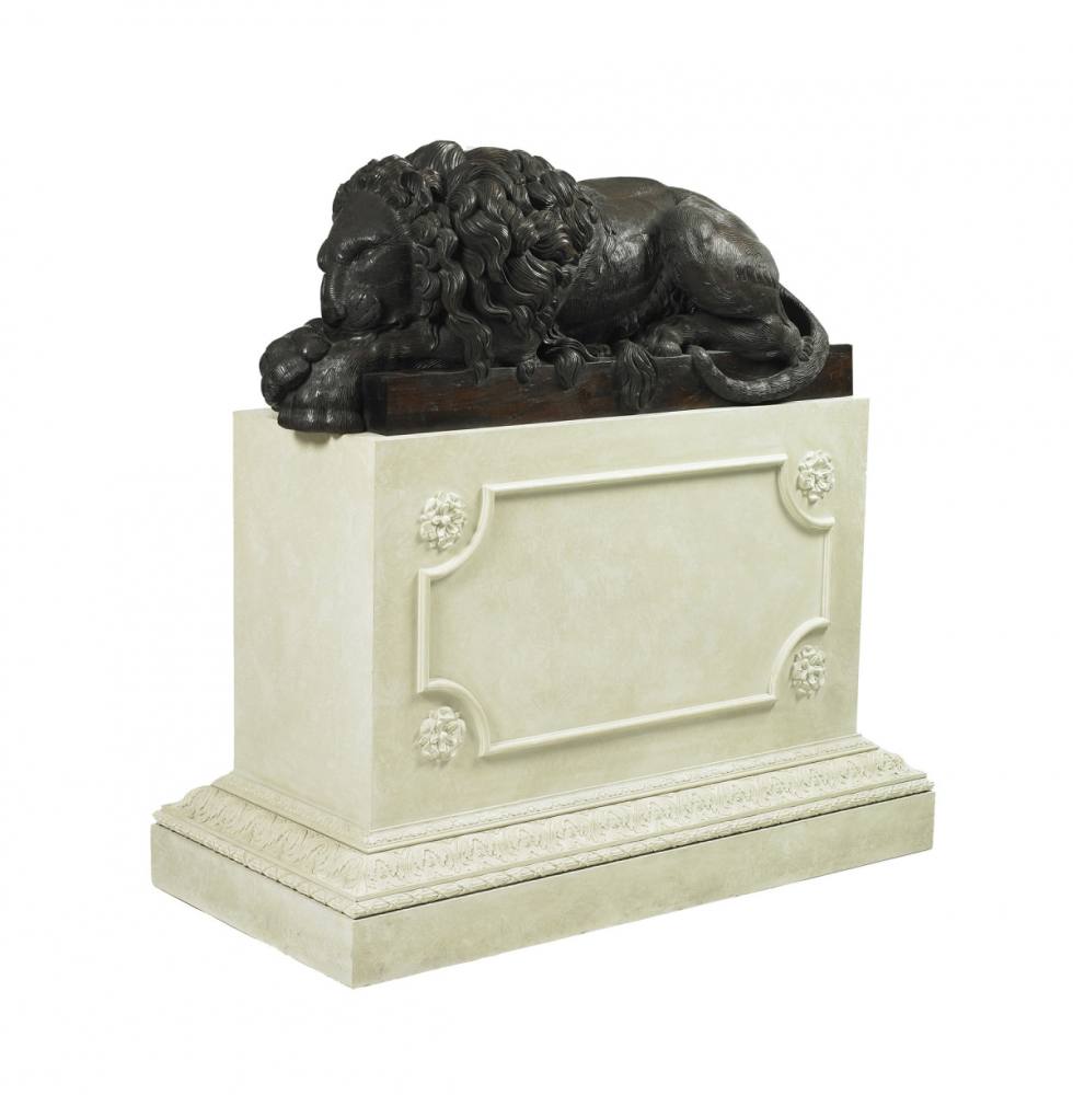 A large scale carved mahogany Grand Tour recumbent lion, resting on a carved and painted architectural base.