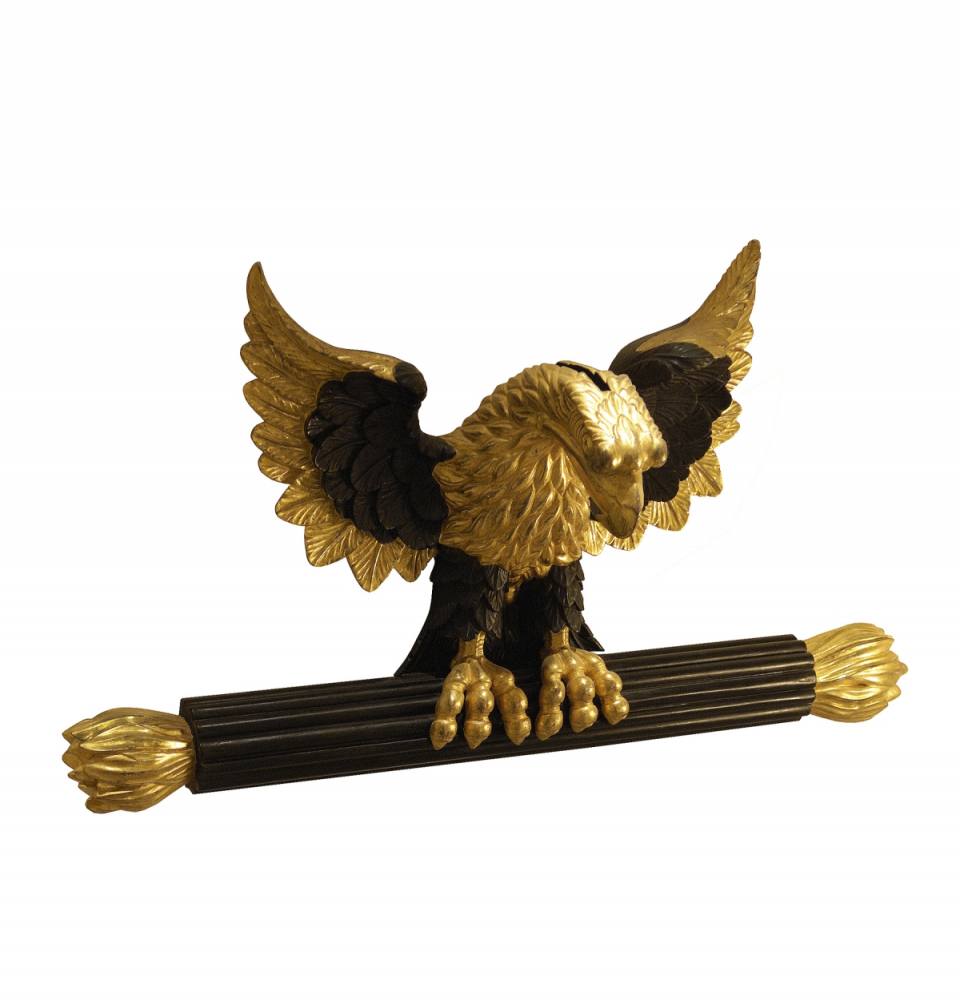 A carved wood and parcel gilt over-door. The richly carved eagle, with outstretched wings, grasps the turned and reeded column in its claws.