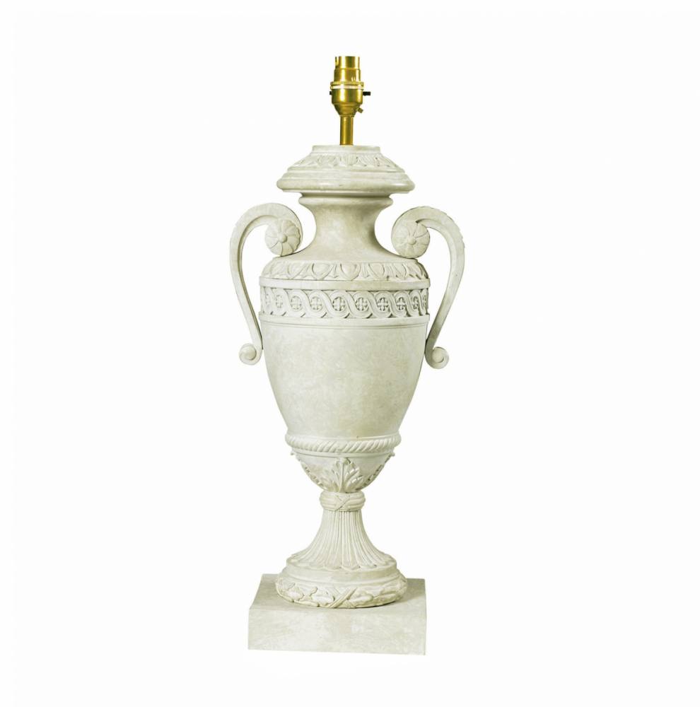 A carved and painted Robert Adam inspired table lamp with guilloche and egg and dart decoration, on square platform base.