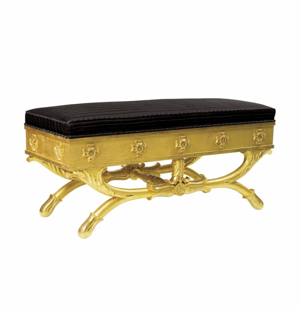 A Regency giltwood window seat, the panelled frieze inset with carved paterae, supported by a naturalistically carved ‘x’ frame base.