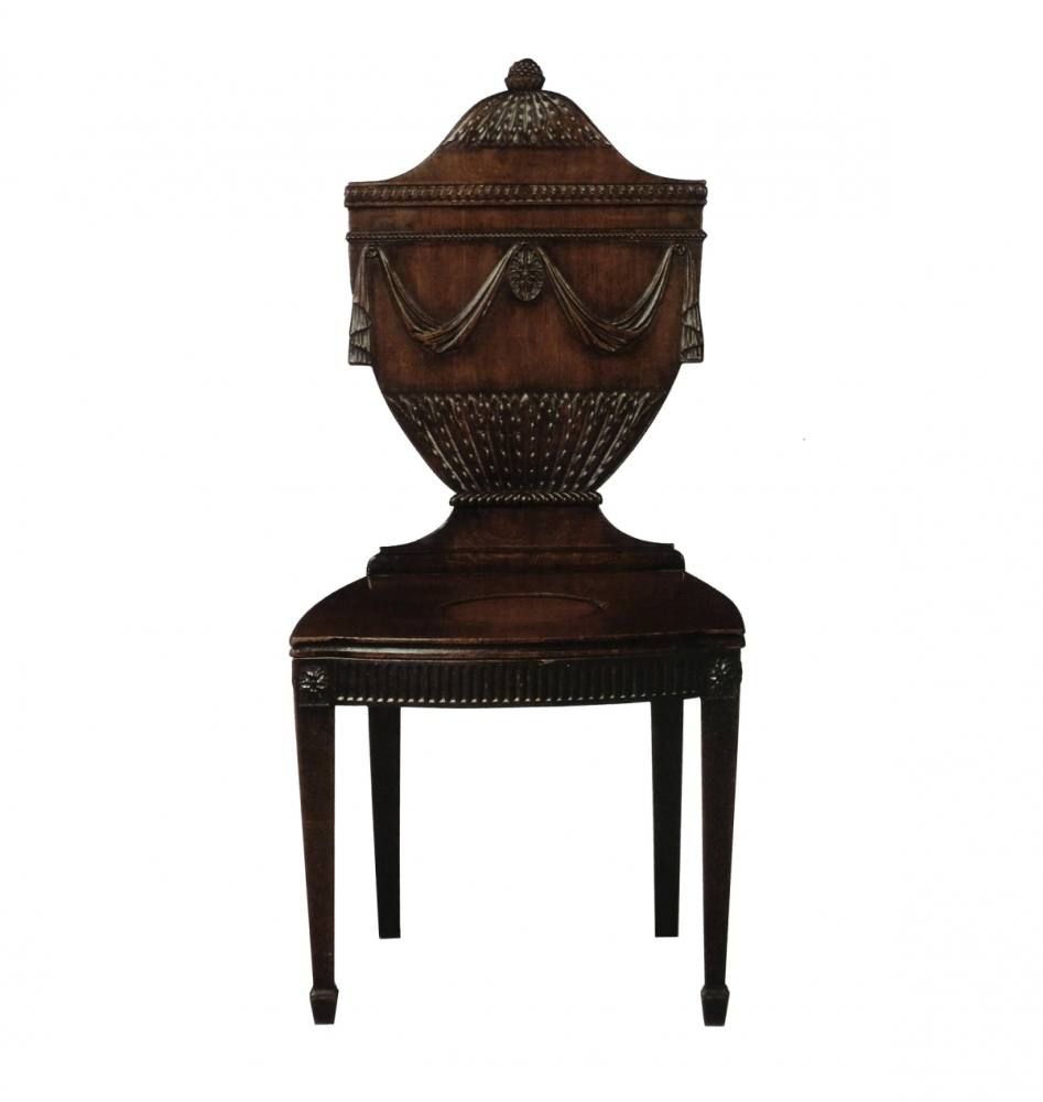 A fine Hepplewhite design hall chair with urn shaped back and acanthus leaf drapery carving. The seat with circular recessed panel above a fluted frieze and tapered legs.