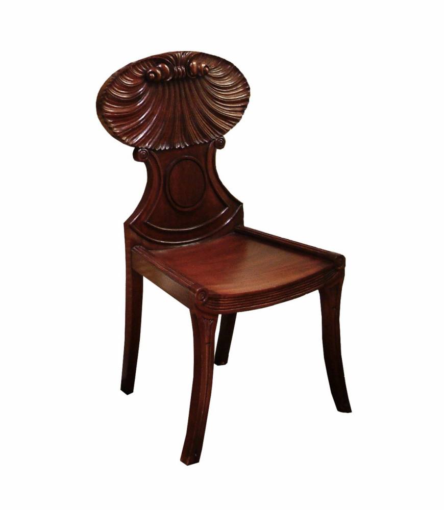 A Regency design, shell backed, carved mahogany hall chair, with an inset painted crest to the lower back, on panelled sabre legs.