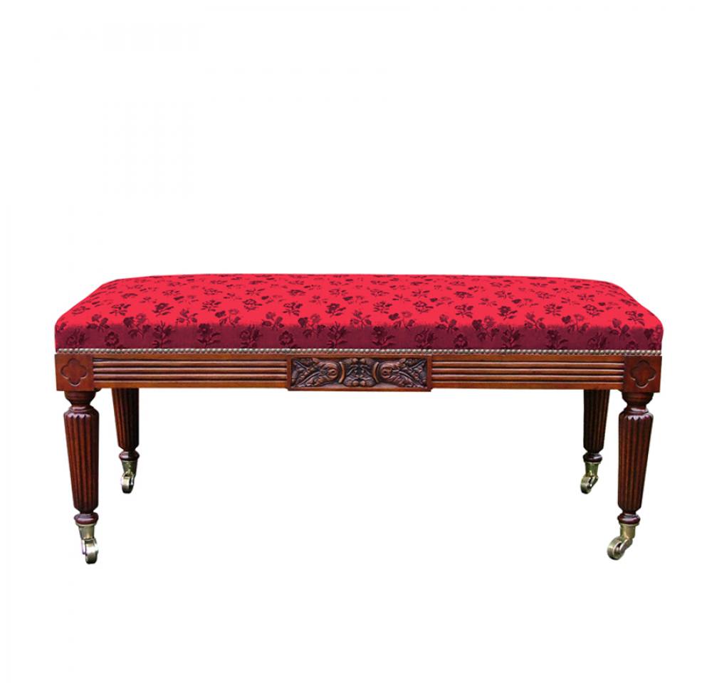 A finely carved and reeded mahogany stool, with a central panel of oak leaves and quatrefoil corner paterae, on brass casters.