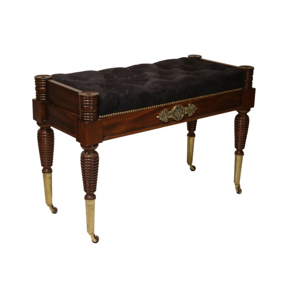 A Regency turned mahogany and brass mounted window seat on elongated brass casters.