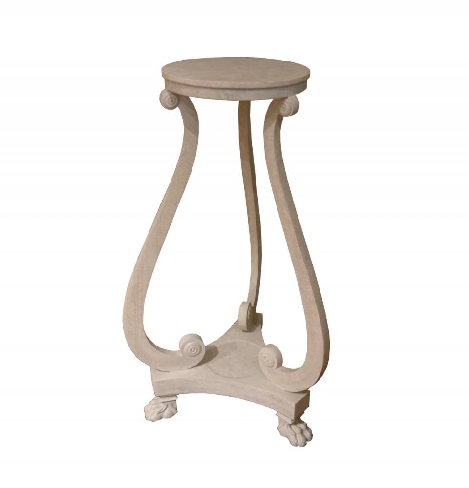 A marble topped three scroll torchere on triform base with carved paw feet.