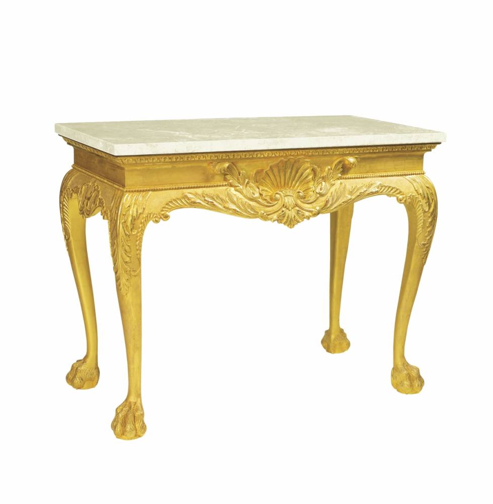 A fine carved giltwood shell and acanthus decorated console table with carved cabriole legs and hairy paw feet.