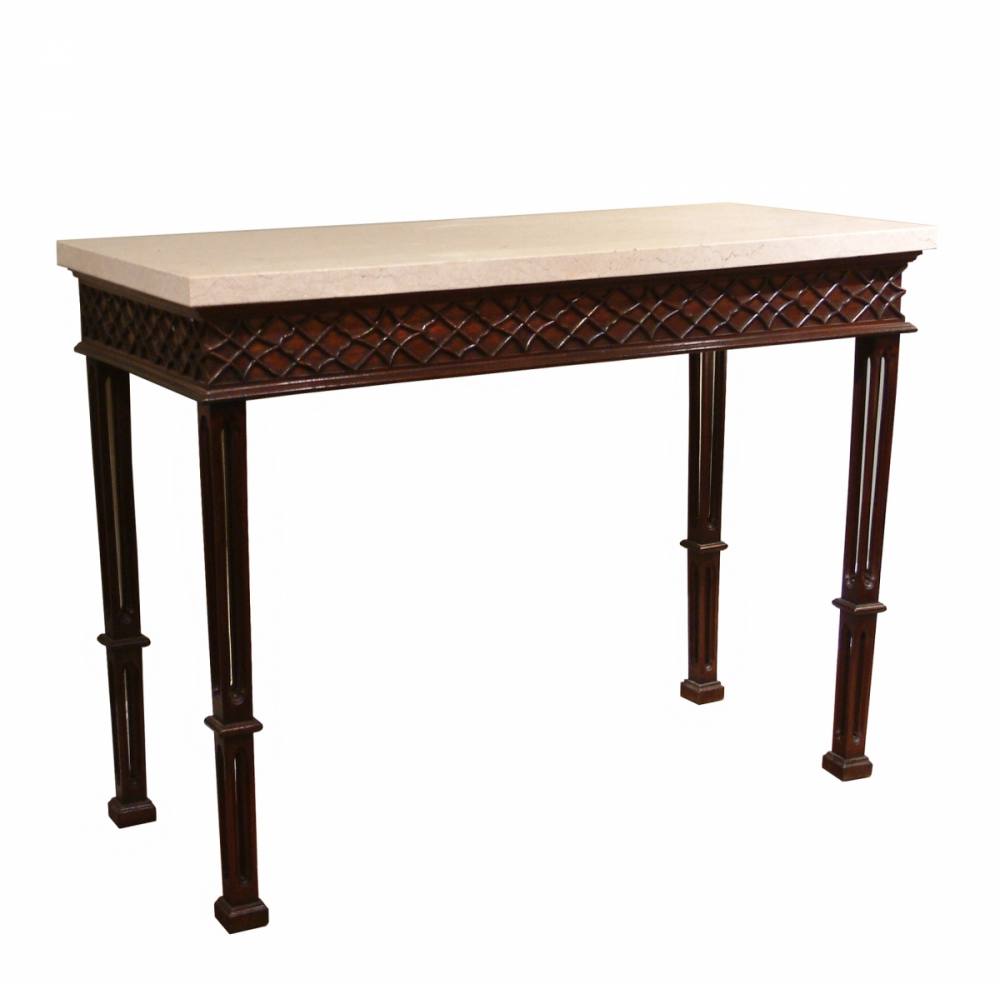 A Chippendale carved mahogany side table, with blind fret frieze and pierced tapering legs with a marble top. Also available with a veneered mahogany top.