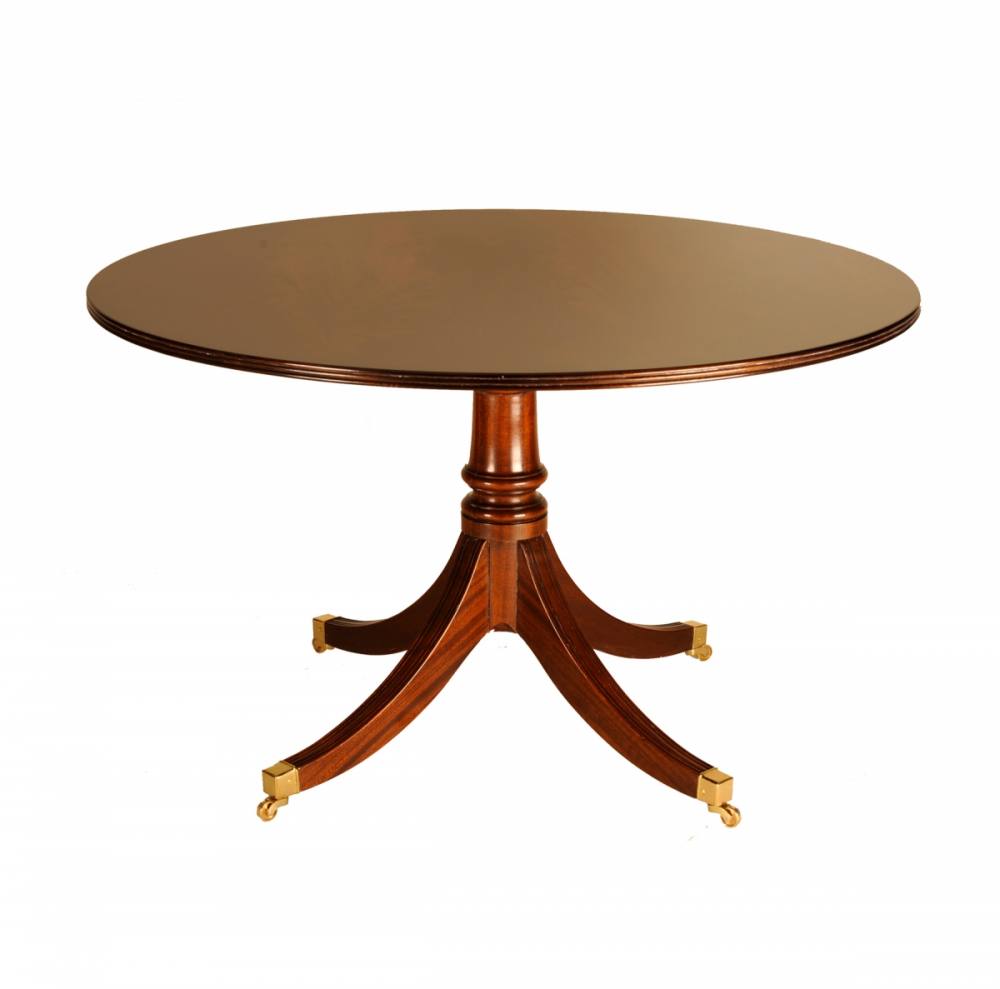 Sheraton style with turned barrel column and tapered reeded splayed leg base with brass castors. The top is finished in a beautifully figured swirl mahogany veneer.